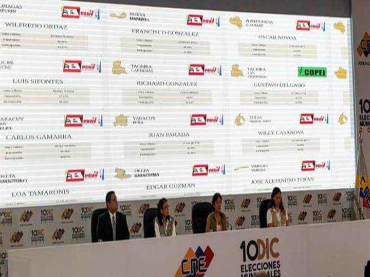 Los primeros resultados de las elecciones municipales fueron anunciados por la La vicepresidenta del Consejo Nacional Electoral (CNE), Sandra Oblitas, en la noche del domingo, 10 de diciembre, donde eligieron 335 alcaldes y el gobernador del estado Zulia.