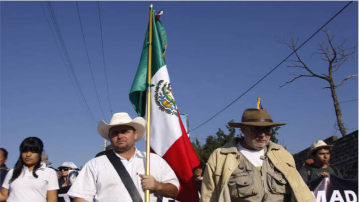 Julián LeBarón sostiene la bandera de México en la Caravana por la Paz